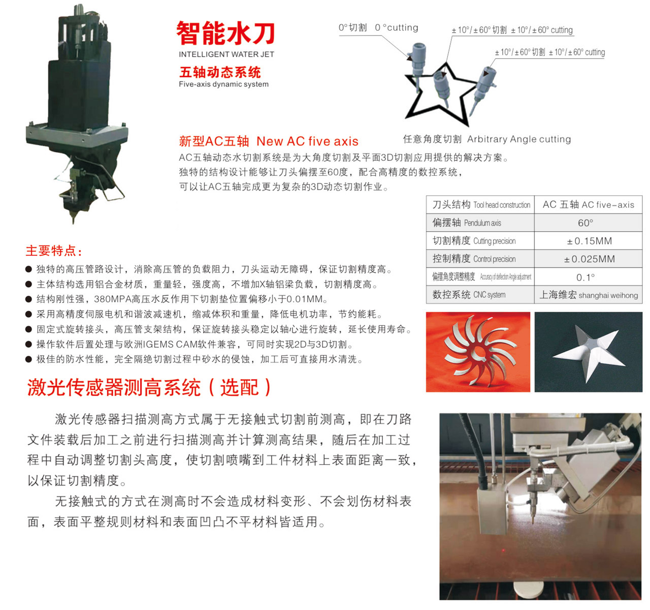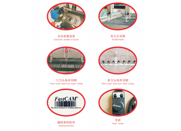 用戶選配 1、翻轉(zhuǎn)臺(tái)面 2、油冷機(jī)阿 3、風(fēng)冷機(jī) 4、軟化水系統(tǒng) 5、精密砂量控制漏砂器 6、無(wú)線遙控 7、自動(dòng)變量油泵 8、雙刀頭切割 9、多刀頭純水切割 10、自動(dòng)清砂系統(tǒng) 11、手輪